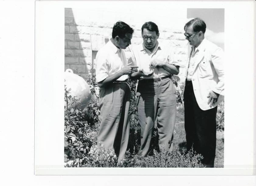 Prof. Karl Georg Kuhn (middle) is checking in the garden of the PAM in spring 1957 a section of the Copper scroll (has nothing to do with the BBC-filming!)
